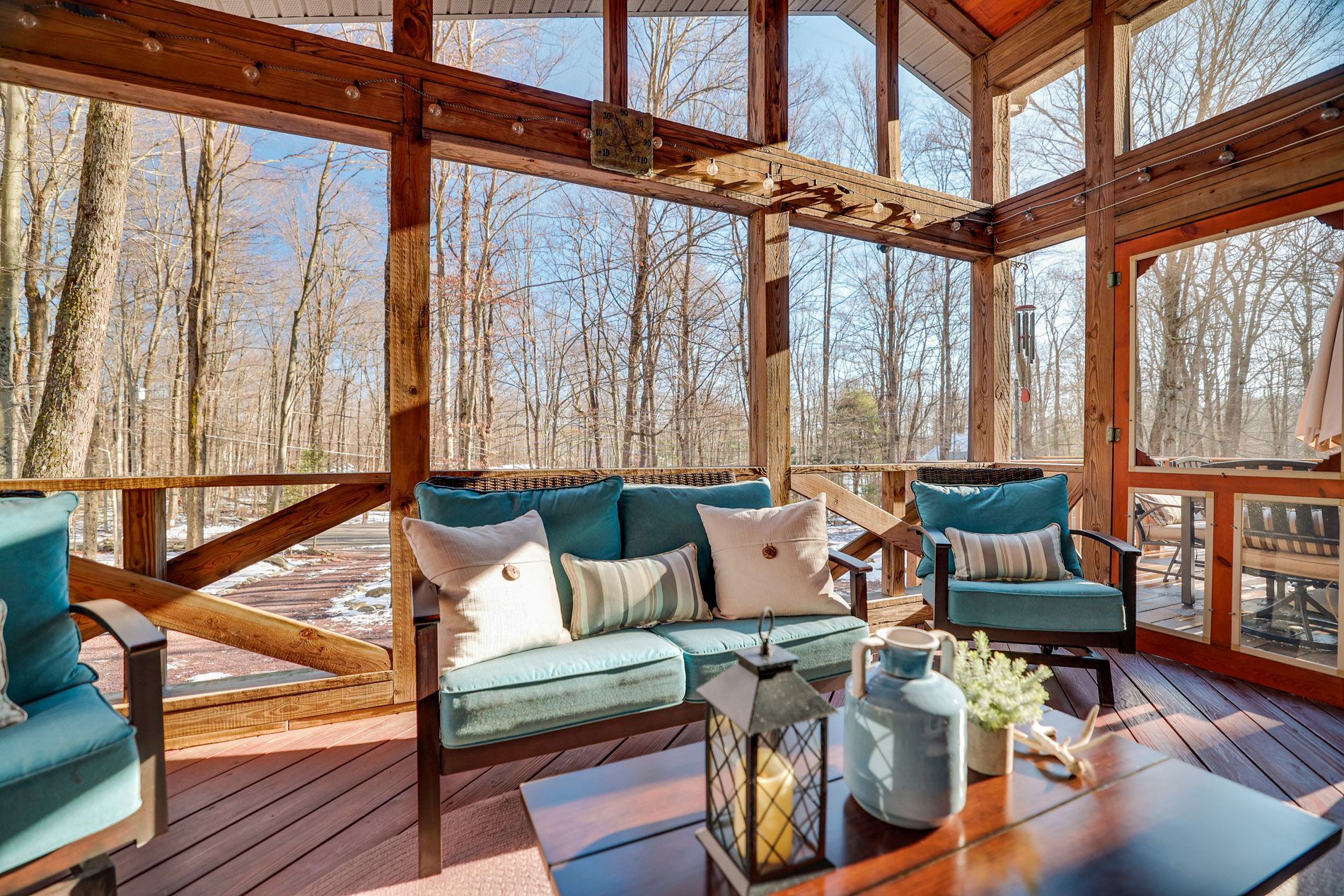 Unwind in the living room, centered around a fireplace and featuring a Wi-Fi-enabled 75-inch smart TV for cozy movie nights. Double sliding doors lead to a screened-in porch, offering picturesque views of the wooded landscape.